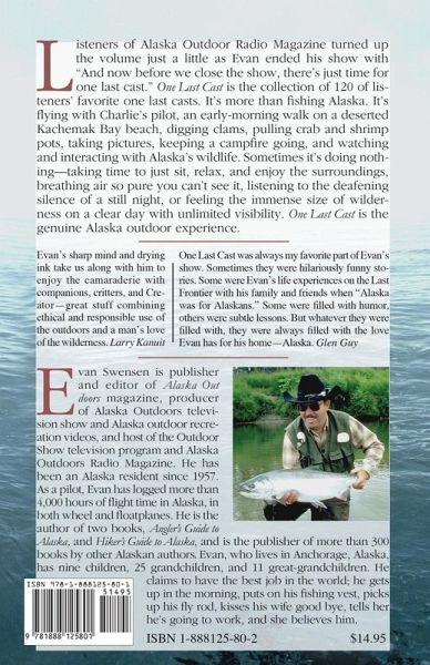 Listeners of Alaska Outdoor Radio Magazine turned up the volume just a little as Evan ended his show with "And now before we close the show, there's just time for one last cast." One Last Cast is the collection of 120 of listeners' favorite one last casts. It's more than fishing Alaska. It's flying with Charlie's pilot, an early-morning walk on a deserted Kachemak Bay beach, digging clams, pulling crab and shrimp pots, taking pictures, keeping a campfire going, and watching and interacting with Alaska's wildlife. Sometimes it's doing nothing -- taking time to just sit, relax, and enjoy the surroundings, breathing air so pure you can't see it, listening to the deafening silence of a still night, or feeling the immense size of wilderness on a clear day with unlimited visibility. One Last Cast is the genuine Alaska outdoor experience.