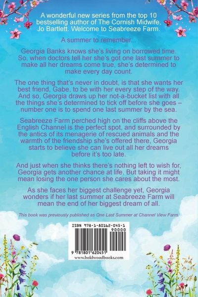Pre-order the next emotional read in the Seabreeze Farm series, from best-selling author Jo Bartlett...but have your tissues ready! .A summer to remember... Georgia Banks knows she's living on borrowed time. So, when doctors tell her she's got one last summer to make all her dreams come true, she's determined to make every day count. The one thing that's never in doubt, is that she wants her best friend, Gabe, to be with her every step of the way. And so, Georgia draws up her not-a-bucket list with all the things she's determined to tick off before she goes - number one of which is to spend one last summer by the sea. Seabreeze Farm perched high on the cliffs above the English Channel is the perfect spot, and surrounded by the antics of its menagerie of rescued animals and the warmth of the friendship she's offered there, Georgia starts to believe she can live out all her dreams before it's too late. And just when she thinks there's nothing left to wish for, Georgia gets another chance at life. But taking it might mean losing the one person she cares about the most. As she faces her biggest challenge yet, Georgia wonders if her last summer at Seabreeze Farm will mean the end of her biggest dream of all. This book was previously published as One Last Summer at Channel View Farm Praise for Jo Bartlett: 'I love second chance stories. I love returning home stories. So a book combining both is an absolute winner for me. The Cornish Midwife is simply gorgeous. Stunning setting, wonderful characters, and oozing with warmth. A triumph from Jo Bartlett.' Jessica Redland 'Perfectly written and set in the beating heart of a community, this story is a wonderful slice of Cornish escapism.' Helen J Rolfe