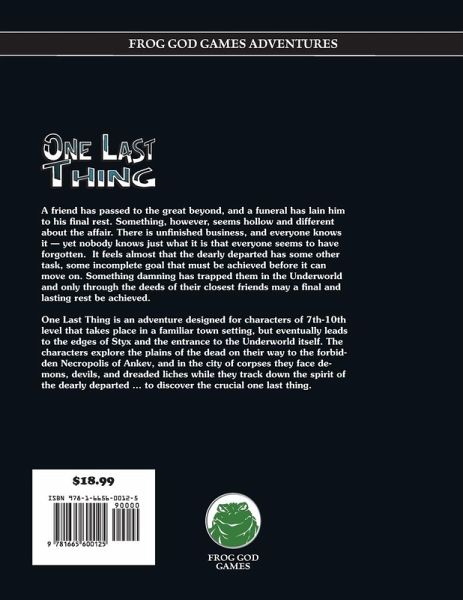 A friend has passed to the great beyond, and a funeral has lain him to his final rest. Something, however, seems hollow and different about the affair. There is unfinished business, and everyone knows it - yet nobody knows just what it is that everyone seems to have forgotten. It feels almost that the dearly departed has some other task, some incomplete goal that must be achieved before it can move on. Something damning has trapped them in the Underworld and only through the deeds of their closest friends may a final and lasting rest be achieved. One Last Thing is an adventure designed for characters of 7th-10th level that takes place in a familiar town setting, but eventually leads to the edges of Styx and the entrance to the Underworld itself. The characters explore the plains of the dead on their way to the forbidden Necropolis of Ankev, and in the city of corpses they face demons, devils, and dreaded liches while they track down the spirit of the dearly departed ... to discover the crucial one last thing.