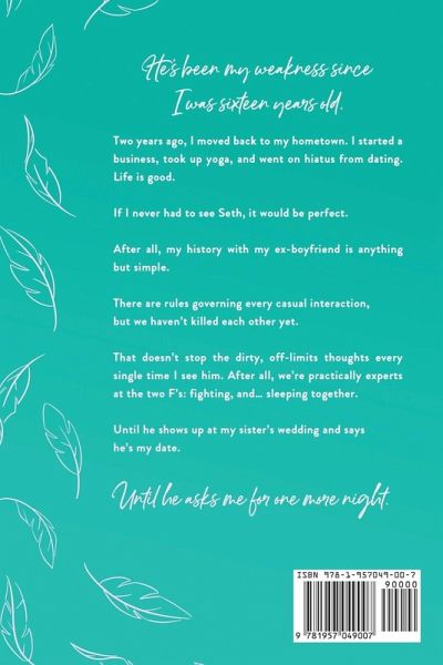 He's been my weakness since I was sixteen years old. Two years ago, I moved back to my hometown. I started a business, bought a house, took up yoga, and went on hiatus from dating. Life is good. If I never had to see Seth, it would be perfect. After all, my history with my ex-boyfriend is anything but simple. It's taken us years, but we've finally learned to live in the same town without killing each other. Is there an elaborate set of rules governing our every casual interaction? Yes. Do I still think dirty, off-limits thoughts every single time I see him buying apples at the grocery store? Of course. I'm only human, and Seth and I are practically experts at the two F's: fighting, and... sleeping together. Still, we're managing just fine. But then? He shows up at my sister's wedding. The man looks like pure sex in a suit, handsome as the devil himself and twice as charming. Worse, he claims he's my date. We flirt. We dance. We break every one of our carefully-crafted rules. We should stop, but I'm having the time of my life. I know I should end it. After all the heartbreak, hurt, and anger we can't be more than enemies. But Seth asks me for one more night. Just one night, and then we're back to being virtual strangers. I know I should turn him down. I know this ends with my heart shattered into a million pieces. I know lunacy is doing the same thing over and over and expecting different results. But I've always been bad at resisting a weakness.