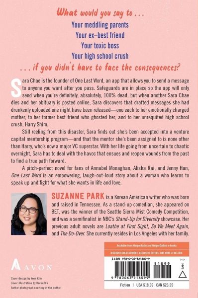 “With pitch-perfect humor, endearing insights and wonderfully relatable characters, One Last Word is a smart and breezy read about taking hold of the life you want and refusing to let go. An absolute delight.” —Allison Winn Scotch, bestselling author of Take Two, Birdie Maxwell What would you say to your meddling parents, your ex-best friend, your toxic boss, or your high school crush if you didn’t have to face the consequences? Sara Chae is the founder of One Last Word, an app that allows you to send a message to anyone you want after you pass. Safeguards are in place so the app will only send when you’re definitely, absolutely, 100% dead, but when another Sara Chae dies and her obituary is posted online, Sara discovers that drafted messages she had drunkenly uploaded on one night have been released —one each to her emotionally charged mother, to her former best friend who ghosted her, and to her unrequited high school crush, Harry Shim. Still reeling from this disaster, Sara finds out she’s been accepted into a venture capital mentorship program— and that the mentor she’s been assigned to is none other than Harry, who’s now a major VC superstar. With her life going from uncertain to chaotic overnight, Sara has to deal with the havoc that ensues and reopen wounds from the past to find a true path forward. A pitch-perfect homage for fans of Annabel Monaghan, Alisha Rai, and Jenny Han, One Last Word is an empowering, laugh-out-loud story about a woman who learns to speak up and fight for what she wants in life and love.