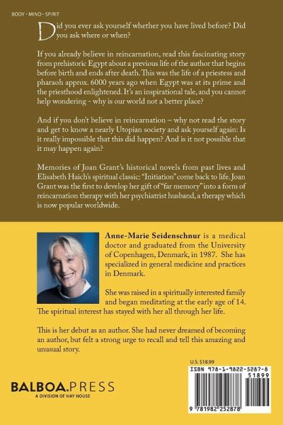 Did you ever ask yourself whether you have lived before? Did you ask where or when? If you already believe in reincarnation, read this fascinating story from prehistoric Egypt about a previous life of the author that begins before birth and ends after death. This was the life of a priestess and pharaoh approx. 6000 years ago when Egypt was at its prime and the priesthood enlightened. It's an inspirational tale, and you cannot help wondering - why is our world not a better place? And if you don't believe in reincarnation - why not read the story and get to know a nearly Utopian society and ask yourself again: Is it really impossible that this did happen? And is it not possible that it may happen again? Memories of Joan Grant's historical novels from past lives and Elisabeth Haich's spiritual classic: "Initiation" come back to life. Joan Grant was the first to develop her gift of "far memory" into a form of reincarnation therapy with her psychiatrist husband, a therapy which is now popular worldwide.