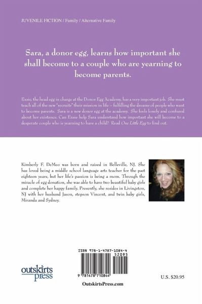 One Little Egg by Kimberly F. DeMeo is a children's book which was written to teach kids about egg donation in a colorful, lively, kid friendly way. The theme of this book is important because today more and more people are getting married and waiting to have children at an older age. For a staggering number of women, it is not easy to conceive a child on their own, so they have to use methods such as in vitro fertilization (IVF). Unfortunately, a large number of these IVF cases are unsuccessful. That is where the miracle of egg donation comes into play. For families who want to have a child and cannot on their own, egg donation is their last resort. But what about the children of egg donation? How does learning about how they were conceived affect them? Unfortunately, there is still an unnecessary negative stigma when it comes to using an egg donor in order to get pregnant. This should not be! Explaining to children of egg donation how they were conceived at an early age is vital in raising a well-adjusted, happy and successful child! Children will love reading this book. This story is unique in that it is told from the viewpoint of the egg and is relatable to children. Exsie the donor egg is the main character in One Little Egg. It is her job to explain egg donation to the younger eggs, or "recruits" as they are called in the book. She explains the crucial role they have in helping a family's dream of having a baby come true. Children will relate to an adorable little egg named Sara who struggles with her existence. She is at the "Egg Donor Academy" being taught what her role is in helping couple who is yearning to have a baby. This story is filled with action, emotion and of course, education about egg donation. The author was compelled to write this children's book for two very important reasons, and their names are Miranda and Sydney! After five long years of unsuccessful procedures, she and her husband decided to have a baby through egg donation. Fortunately,