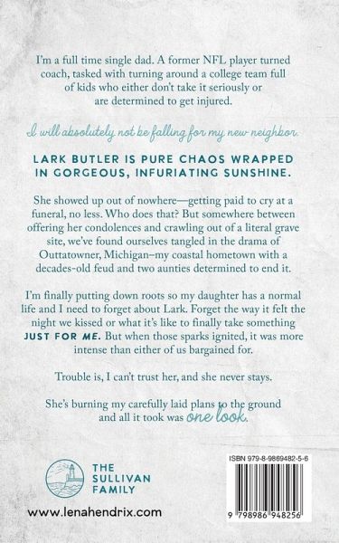 I'm a full time single dad. A former NFL player turned coach, tasked with turning around a college team full of kids who either don't take it seriously or are determined to get injured. I will absolutely not be falling for my new neighbor. Lark Butler is pure chaos wrapped in gorgeous, infuriating sunshine. She showed up out of nowhere--getting paid to cry at a funeral, no less. Who does that? But somewhere between offering her condolences and crawling out of a literal grave site, we've found ourselves tangled in the drama of Outtatowner, Michigan-my coastal hometown with a decades-old feud and two aunties determined to end it. I'm finally putting down roots so my daughter has a normal life and I need to forget about Lark. Forget the way it felt the night we kissed or what it's like to finally take something just for me. But when those sparks ignited, it was more intense than either of us bargained for. Trouble is, I can't trust her, and she never stays. She's burning my carefully laid plans to the ground and all it took was one look.