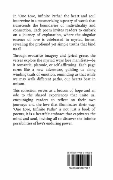 In "One Love, Infinite Paths," the heart and soul intertwine in a mesmerizing tapestry of words that transcends the boundaries of individuality and connection. Each poem invites readers to embark on a journey of exploration, where the singular essence of love is celebrated in myriad forms, revealing the profound yet simple truths that bind us all. Through evocative imagery and lyrical grace, the verses explore the myriad ways love manifests-be it romantic, platonic, or self-affirming. Each page turns like a new adventure, guiding us along winding trails of emotion, reminding us that while we may walk different paths, our hearts beat in unison. This collection serves as a beacon of hope and an ode to the shared experiences that unite us, encouraging readers to reflect on their own journeys and the love that illuminates their way. "One Love, Infinite Paths" is not just a book of poems; it is a heartfelt embrace that captivates the mind and soul, inviting all to discover the infinite possibilities of love's enduring power.