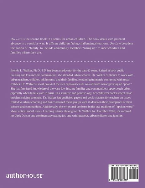 "One Love" is the first book in a series for urban children. The book deals with parental substance abuse in a sensitive way. It promotes ways to affirm children facing challenging situations. "One Love" broadens the notion of "family' to include community members "stepping up" to support children and families in crisis.