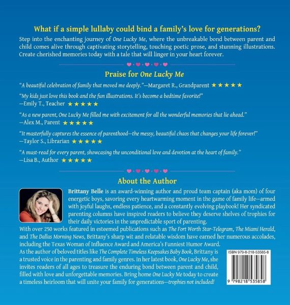 Brittany Belle is an award-winning author and proud team captain (aka mom) of four energetic boys, savoring every heartwarming moment in the game of family life-armed with joyful laughs, endless patience, and a constantly evolving playbook! Her syndicated parenting columns have inspired readers to believe they deserve shelves of trophies for their daily victories in the unpredictable sport of parenting. With over 250 works featured in prestigious publications such as The Fort Worth Star-Telegram, The Miami Herald, and The Dallas Morning News, Brittany's sharp wit and relatable wisdom have earned her numerous accolades, including the Texas Woman of Influence Award and America's Funniest Humor Award. As the author of beloved titles like The Complete Timeless Keepsakes Baby Book and Writing Special Keepsake Letters to Your Children, Brittany is a trusted voice in the parenting and family genres. Her books capture the magic of everyday moments, fostering lasting connections and meaningful traditions that bring families closer together. In One Lucky Me, Brittany invites readers of all ages-parents, children, grandparents, and families alike-to celebrate the enduring bond that unites us all. This touching story beautifully unfolds through the stages of a child's life, echoing the love that transcends time and distance, much like the cherished lullaby that gently closes each chapter. Filled with stunning illustrations, heartwarming laughter, and unforgettable memories, it's a book meant to be treasured by kids and adults alike. Available in hardcover, paperback, and eBook formats, One Lucky Me is the perfect gift for baby showers, birthdays, holidays, or simply creating special moments with your loved ones. Bring home this timeless heirloom today to unite your family for generations-trophies not included!