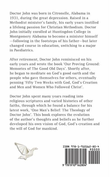 Doctor John was born in Citronelle, Alabama in 1931, during the great depression. Raised in a Methodist minister's family, his early years instilled a lifelong passion for Christian Methodism. Doctor John initially enrolled at Huntingdon College in Montgomery Alabama to become a minister himself -following in the footsteps of his father-but later changed course in education, switching to a major in Paediatrics. After retirement, Doctor John reminisced on his early years and wrote the book 'Our Proving Ground: Memories of The Good Old Days'. Shortly after, he began to meditate on God's good earth and the people who gave themselves for others, eventually penning 'Fifty Two Weeks with God, God's Creation and Men and Women Who Followed Christ'. Doctor John spent many years reading into religious scriptures and varied histories of other faiths, through which he found a balance for his latest work, 'One Man's Belief: The Theology of Doctor John'. This book explores the evolution of the author's thoughts and beliefs as he further developed his own vision of God, God's creation and the will of God for mankind.