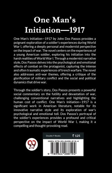 One Man's Initiation-1917 by John Dos Passos provides a poignant exploration of a soldier's experiences during World War I, offering a deeply personal and modernist perspective on the impact of war. The novel centers on the experiences of a young American soldier, exploring his initiation into the harsh realities of World War I. Through a modernist narrative style, Dos Passos delves into the psychological and emotional effects of combat on the protagonist, capturing the intense and often traumatic experiences of trench warfare. The novel also addresses anti-war themes, offering a critique of the glorification of military conflict and the social and political dynamics that drive war. Through the soldier's story, Dos Passos presents a powerful social commentary on the futility and devastation of war, challenging conventional narratives and highlighting the human cost of conflict. One Man's Initiation-1917 is a significant work in American literature, notable for its innovative narrative style and its exploration of war's psychological and emotional toll. Dos Passos's portrayal of the soldier's experiences provides a profound and critical perspective on the impact of World War I, making it a compelling and thought-provoking read.
