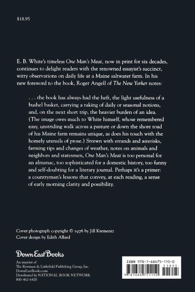 In print for fifty-five years, One Man's Meat continues to delight readers with E.B. White's witty, succinct observations on daily life at a Maine saltwater farm. Strewn with errands and asterisks, farm tips and changes of weather, notes on animals and neighbors and statesmen, One Man's Meat is too personal for an almanac, too sophisticated for a domestic history, too funny and self-doubting for a literary journal. Perhaps it's a primer: a countryman's lessons that convey, at each reading, a sense of early morning clarity and possibility.