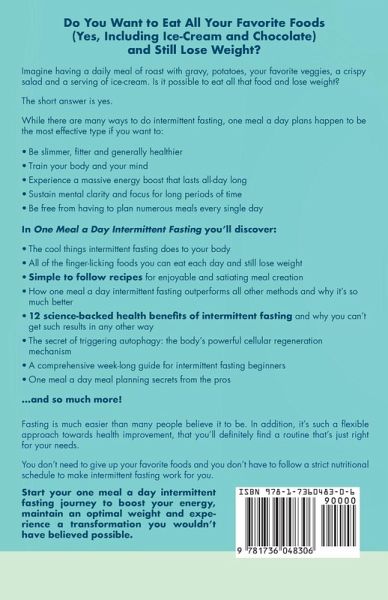 Do You Want to Eat All Your Favorite Foods (Yes, Including Ice-Cream and Chocolate) and Still Lose Weight? Imagine having a daily meal of roast with gravy, potatoes, your favorite veggies, a crispy salad and a serving of ice-cream. Is it possible to eat all that food and lose weight? The short answer is yes. The long answer is yes if you're doing one meal a day intermittent fasting. Eating just one meal a day isn't as hard as you may think, especially keeping in mind there are barely any restrictions when it comes to the foods you can consume. One meal a day intermittent fasting gives you hardcore results without making you feel starved and deprived. Not only does it contribute to sustainable, long term weight loss, it can also improve your health and slow down the aging process. In fact, research reveals that intermittent fasting could be an effective management and therapeutic strategy for serious conditions like heart disease and even certain types of cancer. While there are many ways to do intermittent fasting, one meal a day plans happen to be the most effective type if you want to:Be slimmer, fitter and generally healthier Train your body and your mind Experience a massive energy boost that lasts all-day long Sustain mental clarity and focus for long periods of time Be free from having to plan numerous meals every single day Intermittent fasting is nothing new. It's been practiced for millennia by our predecessors. Romans ate just one meal a day to maintain sharpness. The same applied to warriors from numerous civilizations. Today, elite athletes like Rhonda Rousey and Herschel Walker eat just one meal a day to boost their performance. If it works for them, it's definitely going to work for you. In One Meal a Day Intermittent Fasting, you will discover: The cool things intermittent fasting does to your body All the finger-licking foods you can eat each day and still lose weight Simple to follow recipes for enjoyable and satiating meal creation How one meal a day intermittent fasting outperforms all other methods and why it's so much better 12 science-backed health benefits of intermittent fasting and why you can't get such results in any other way The secret of triggering autophagy: the body's powerful cellular regeneration mechanism A comprehensive week-long guide for intermittent fasting beginners One meal a day meal planning secrets from the pros And much more! Fasting is much easier than many people believe it to be. In addition, it's such a flexible approach towards health improvement, that you'll definitely find a routine that's just right for your needs. You don't need to give up your favorite foods and you don't have to follow a strict nutritional schedule to make intermittent fasting work for you. In fact, you remain in control the entire time. Not only that but you'll also enjoy a ton of freedom since meal prep is limited when you adopt the lifestyle.