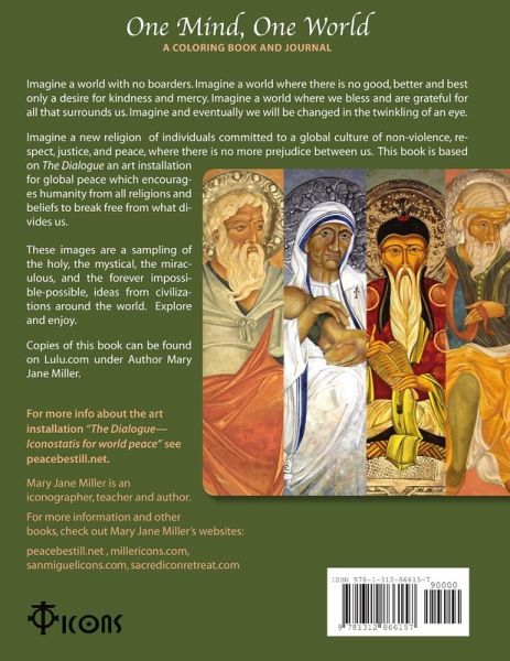 Our journal/coloring book is an interfaith workbook for children and adults alike which explores interfaith peace between religions - Buddhism, Christianity, the Mayans etc. Experiment with gods and goddesses, to create your own reflections on ecumenicism, multi-culture and pluralism. It becomes a visual journal, where you color the illustrations as well as write the text. One Mind, One World is a pathway to peace, rejoicing in our Diversity through interfaith Dialogue. As a guide, the Workbook h Ambassadors for interfaith gives information so you can explore faiths practices around the world. This coloring book contains line drawing of the paintings from The Dialogue Installation for peace and represents a sampling of the holy, the mystical, the miraculous, and the forever impossible-possible, ideas from civilizations. Interfaith and peace education curriculum's might one day be required in every school at every level, as well as religious education and tolerance programs in every temple, ashram, church and mosque world-wide. New age spirituality and ancient wisdom work together in this collection, aiming at highlighting the human search for divinity and the diversity we have shared. Looking over the images, noticing their purpose and historical dates hopefully will encourage some curiosity, to know more and understand what part of the archetypes live in you. Our consciousness is changing. Are we willing to allow Jesus and the philosopher Lao Tzu, to be positioned beside the Mayan corn God and Buddha beside Mohammad? Use the Journal space to record what you "hear" and "receive" from coloring the images. In the process, recognize commonalities and your response. Ask questions and write as if the "answers" given becomes your memoir