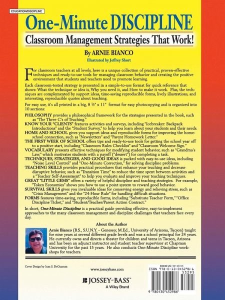 For classroom teachers at all levels, here is a unique collection of practical, proven-effective techniques and ready-to-use tools for managing classroom behavior and creating the positive environment that students and teachers need to promote learning. Each classroom-tested strategy is presented in a simple-to-use format for quick reference that shows: What the technique or idea is, Why you need it, and How to make it work. Plus, the techniques are complemented by support ideas, time-saving reproducible forms, lively illustrations, and interesting, reproducible quote about teaching. For easy to use, it's all printed in a big, 8-1/2" x 11" lay-flat format for easy photocopying and its organized into 10 sections: * PHILOSOPHY provides a philosophical framework for the strategies presented in the book, such as "The Three C's of Teaching." * KNOW YOU "CLIENTS" features activities and surveys, including "Icebreaker: Backpack Introductions" and the "student Survey," to help you learn about your students and their needs. * HOME AND SCHOOL gives you support ideas and reproducible forms for improving the home school connection, such as "Newsletters" and "Parent Homework Letter." * THE FIRST WEEK OF SCHOOL offers tops and ready-to-use tools for getting the school year off to a positive start, including "Classroom Rules Checklist" and "Classroom Welcome Sign." * VOCABULARY presents effective techniques for modifying student behavior, such as "Grandma's Law," which motivates students with a payoff ("desert") for completing a task. * TECHNIQUE, STRATEGIES, AND GOOD IDEAS is packed with easy-to-use ideas, including "Noise Level Control" and "One-Minute Correction," for solving discipline problems. * TEACHING SKILLS provides practical procedures that enhance your teaching and decrease disruptive behavior, such as "Transition Time" to reduce the time spent between activities and a "Teacher Self-Assessment" to help you evaluate and improve your teaching techniques. * GREAT "LITTLE GEMS" offers a variety of helpful discipline and teaching strategies. For example, "Token Economies" shows you how to use a pint system to reward good behavior. * SURVIVAL SKILLS gives you invaluable ideas for conserving energy and relieving stress, such as "Crisis Management" and the "24-Hour Rule" for handling difficult situations. * FORMS features time-saving, reproducible forms, including "Substitute Teacher Form," "Office Discipline Ticket," and "Student/Teacher/Parent Action Contract." In short, One-Minute Discipline is a practical guide providing effective, easy-to-implement approaches to the many classroom management and discipline challenges that teaches face every day.