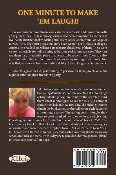 These one-minute monologues are extremely sarcastic and humorous with great punch lines. These monologues have also been recognized by winners at IMTA, the International Modeling and Talent Association, from Los Angeles to New York. The short pieces that have been written are for kids of all ages. Anyone who reads them will get a great hearty chuckle out of them. These were written especially for kids wanting to become real actors/actresses. They can use them for any audition piece that needs to be rather short. These monologues were written to be short and sweet. These are also great for entertainment in drama classes or to say on stage for comedy. Not only that, anyone can have fun reading all fifty of them for great entertainment. This book is great for kids just wanting to perform for their parents on a fun night or entertain their friends at a party.