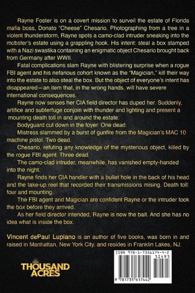 Rayne Foster is on a covert mission to surveil the estate of Florida mafia boss, Donato "Cheese" Chesario. Photographing from a tree in a violent thunderstorm, Foster spots a camo-clad intruder sneaking into the mobster's estate using a grappling hook. His intent: steal a box stamped with a Nazi swastika containing an enigmatic object Chesario brought back from Germany after WWII. Fatal complications slam Foster with blistering surprise when a rogue FBI agent and his nefarious cohort known as the "Magician," kill their way into the estate to also steal the box. But the object of everyone's intent has disappeared-an item that, in the wrong hands, will have severe international consequences. Foster now senses her CIA field director has duped her. Suddenly, artifice and subterfuge conjoin with thunder and lighting and present a mounting death toll in and around the estate: Bodyguard cut down in the foyer. One dead. Mistress slammed by a burst of gunfire from the Magician's MAC 10 machine pistol. Two dead. Chesario, refuting any knowledge of the mysterious object, killed by the rogue FBI agent. Three dead. The camo-clad intruder, meanwhile, has vanished empty-handed into the night. Rayne finds her CIA handler with a bullet hole in the back of his head and the take-up reel that recorded their transmissions missing. Death toll: four and mounting. The FBI agent and Magician are confident Rayne or the intruder took the box before they arrived. As her field director intended, Rayne is now the bait. And she has no idea what is inside the box.