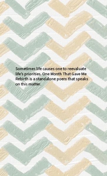 Sometimes life causes one to reevaluate life's priorities. One Month That Gave Me Rebirth is a standalone poem that speaks on this matter.