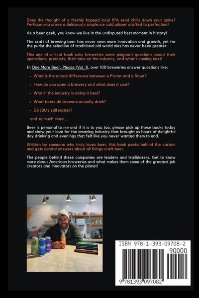Does the thought of a freshly hopped local IPA send chills down your spine? Perhaps you crave a deliciously simple ice cold pilsner crafted to perfection? As a beer geek, you know we live in the undisputed best moment in history! The craft of brewing beer has never seen more innovation and growth, yet for the purist the selection of traditional old world ales has never been greater. This one of a kind book asks breweries some poignant questions about their operations, products, their take on the industry, and what's coming next! In One More Beer, Please (Vol. 1), over 100 breweries answer questions like: ¿ What is the actual difference between a Porter and a Stout? ¿ How do you open a brewery and what does it cost? ¿ Who in the industry is doing it best? ¿ What beers do brewers actually drink? ¿ Do IBU's still matter? and so much more.... Beer is personal to me and if it is to you too, please pick up these books today and show your love for the amazing industry that brought us hours of delightful day drinking and evenings that felt like you never wanted them to end. Written by someone who truly loves beer, this book peeks behind the curtain and gets candid answers about all things craft beer. The people behind these companies are leaders and trailblazers. Get to know more about American breweries and what makes them some of the greatest job creators and innovators on the planet! ¿ Savor this book with your favorite ale today! ¿