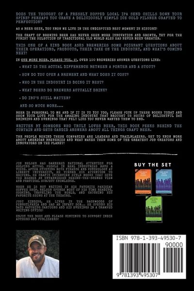 Does the thought of a freshly hopped local IPA send chills down your spine? Perhaps you crave a deliciously simple ice cold pilsner crafted to perfection? As a beer geek, you know we live in the undisputed best moment in history! The craft of brewing beer has never seen more innovation and growth, yet for the purist the selection of traditional old world ales has never been greater. This one of a kind book asks breweries some poignant questions about their operations, products, their take on the industry, and what's coming next! In One More Beer, Please (Vol. 2), over 100 breweries answer questions like: ¿ What is the actual difference between a Porter and a Stout? ¿ How do you open a brewery and what does it cost? ¿ Who in the industry is doing it best? ¿ What beers do brewers actually drink? ¿ Do IBU's still matter? and so much more.... Beer is personal to me and if it is to you too, please pick up these books today and show your love for the amazing industry that brought us hours of delightful day drinking and evenings that felt like you never wanted them to end. Written by someone who truly loves beer, this book peeks behind the curtain and gets candid answers about all things craft beer. The people behind these companies are leaders and trailblazers. Get to know more about American breweries and what makes them some of the greatest job creators and innovators on the planet! ¿ Savor this book with your favorite ale today! ¿