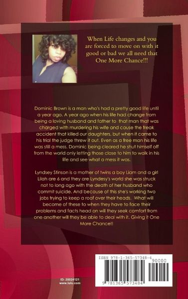 DESCRIPTION Dominic Brown is a man who's had a pretty good life until a year ago. A year ago when his life had change from being a loving husband and father to that man that was charged with murdering his wife and cause the freak accident that killed our daughters, but when it came to his trial the judge threw it out. Even as a free man his life was still a mess. Dominic being cleared he shut himself off from the world only letting those close to him to walk in his life and see what a mess it was. Lyndsey Stinson is a mother of twins a boy Liam and a girl Lilah are 6 and they are Lyndesy's world she was struck not to long ago with the death of her husband who commit suicide. And because of this she's working two jobs trying to keep a roof over their heads. What will become of these to when they have to face their problems and facts head on will they seek comfort from one another will they be able to deal with it. Giving it One More Chance!!