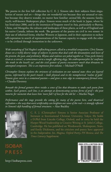 The poems in One More Civil Gesture, the first full collection by C. E. J. Simons, frequently take their subjects from singularities of nature and art - things that are wonderful not because they are unusual or rare, but because they deserve wonder, no matter how familiar: animal life; the seasons; family; myth; well-known Shakespeare plays. They aim, as Geoffrey Hill has said, to restructure banality into beauty without denying the banal. Simons wrote much of the book in Japan, where he has lived since 2006, and in the interstices of frequent travel in Asia, particularly to Burma, China, and Mongolia; the cultures and landscapes of these places, as well as of England and his native Canada, inform the work. The gestures of these poems are civil in two senses: in their bold and exciting use of inherited forms, whether Western or Japanese; and in their aspiration to eschew self-expression in search of representations of the human capacity to engage with the other - to be civilised through immersion in the unknown. "With something of Ted Hughes's unflinching power, allied to a troubled compassion, Chris Simons draws on a richly diverse range of subjects in poems that deal with the devastations and losses of the present, the past, and prehistory. Rhyme and violence are yoked together as 'Time picks history clean as a carcass', a cameraman earns a tough, affecting elegy, 'the anthropomorphic lie' confronts 'the truth in the hawk's eye', and the civil gesture of poetry encounters much that threatens its attempted composure. This is an impressive first volume." (Michael O'Neill) "Beneath the formal gestures in C. E. J. Simons's debut collection, there resides a great sense of loss that threatens to undo each poem from within. Each gesture, each line, is an attempt at domesticating various forms of grief. One More Civil Gesture is a work of beauty." (Mariko Nagai) "In One More Civil Gesture Christopher Simons explores the strictures of civilisation on our natural state: these are layered poems, informed by the poet's travels - both physical and in the metaphorical 'realms of gold'. Simons gives voice to a contained passion - and gives a new edge to contemporary formal writing." (Claudia Daventry) "Performance and the stage provide the setting for many of the poems here, and theatrical stylisation - the way that overt artificiality can heighten our sense of the real - is strongly reflected in Simons's deft handling of formal structures." (Alan Buckley)