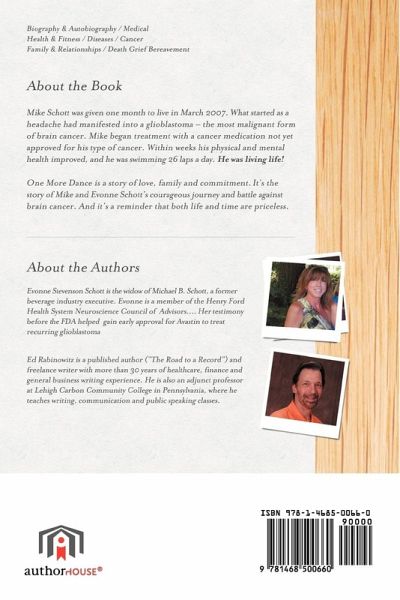 Mike Schott was given one month to live in March 2007. What started as a headache had manifested into a glioblastoma - the most malignant form of brain cancer. Mike began treatment with a cancer medication not yet approved for his type of cancer. Within weeks his physical and mental health improved, and he was swimming 26 laps a day. He was living life! One More Dance is a story of love, family and commitment. It's the story of Mike and Evonne Schott's courageous journey and battle against brain cancer. And it's a reminder that both life and time are priceless.