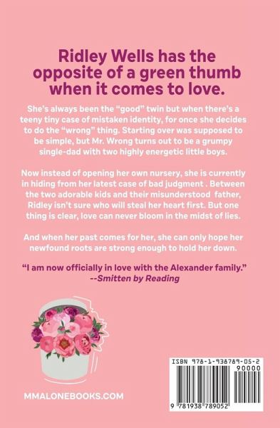 A heartwarming novel about family, friendship and finding your roots from RITA® winner, M. MALONE. The first book in a USA Today bestselling series. Over 100,000+ copies sold! Ridley Wells is done with men. All she wants is to focus on her dream of opening her own nursery but she has the opposite of a green thumb when it comes to love. She's always been the "good twin" who played by all the rules waiting for Prince Charming to show up. Instead she is currently in hiding from her latest case of bad judgment. So when there's a teeny tiny case of mistaken identity, for once she decides to do the "wrong" thing. Starting over was supposed to be simple, but Mr. Wrong turns out to be a grumpy single-dadwith two highly energetic little boys. She was supposed to disappear and start a new life but suddenly she's wrapped up in a small town that feels more like home than any place she's ever been and walking in her sister's shoes feels more like living than hiding in plain sight. Between two adorable kids and their misunderstood and distrusting father, Ridley isn't sure who will steal her heart first. But one thing is clear, love can never bloom in the midst of lies. And when her past comes for her, she can only hope her newfound roots are strong enough to hold her down.