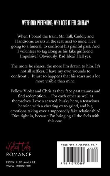 We're only pretending; why does it feel so real? When I board the train, Mr. Tall, Cuddly and Handsome awaits in the seat next to mine. He's going to a funeral, to confront his painful past. And I volunteer to tag along as his fake girlfriend. Impulsive? Obviously. Bad Idea? Hell yes. The more he shares, the more I'm drawn to him. It's not all selfless, I have my own wounds to confront... It just so happens that his scars are a lot more visible than mine. Follow Violet and Chris as they face past trauma and find redemption... For each other as well as themselves. Love a scarred, husky hero, a tenacious heroine with a cheating ex to grind, and big emotions taking over a supposedly fake relationship? Dive right in, because I'm bringing all the feels with this one.