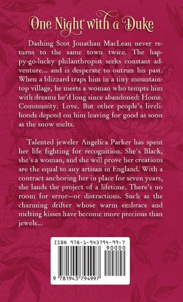 From a New York Times bestselling author: Sparks fly in this definitely-not-falling-in-love workplace romance between a handsome drifter chasing adventure, and a small-town jeweler who would never leave her home behind... Dashing Scot Jonathan MacLean never returns to the same town twice. The happy-go-lucky philanthropist seeks constant adventure... and is desperate to outrun his past. When a blizzard traps him in a tiny mountaintop village, he meets a woman who tempts him with dreams he'd long since abandoned: Home. Community. Love. But other people's livelihoods depend on him leaving for good as soon as the snow melts. No-nonsense jeweler Angelica Parker has spent her life fighting for recognition. She's Black, she's a woman, and she will prove her creations are the equal to any artisan in England. With the project of a lifetime on the line, there's no room for error-or distractions. Especially not the handsome charmer whose unquenchable cheer and melting kisses have become more precious than jewels... The 12 Dukes of Christmas is a series of heartwarming Regency romps nestled in a picturesque snow-covered village. Twelve delightful romances... and plenty of delicious dukes! THE 12 DUKES OF CHRISTMAS: 1. Once Upon a Duke 2. Kiss of a Duke 3. Wish Upon a Duke 4. Never Say Duke 5. Dukes, Actually 6. The Duke's Bride 7. The Duke's Embrace 8. The Duke's Desire 9. Dawn with a Duke 10. One Night with a Duke 11. Ten Days with a Duke 12. Forever Your Duke