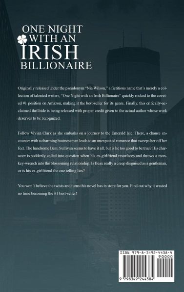 Originally released under the pseudonym "Nia Wilson," a fictitious name that's merely a collection of talented writers, "One Night with an Irish Billionaire" quickly rocked to the coveted #1 position on Amazon, making it the best-seller for its genre. Finally, this critically acclaimed thrill ride is being released with proper credit given to the actual author whose work deserves to be recognized. Follow Vivian Clark as she embarks on a journey to the Emerald Isle. There, a chance encounter with a charming businessman leads to an unexpected romance that sweeps her off her feet. The handsome Beau Sullivan seems to have it all, but is he too good to be true? His character is suddenly called into question when his ex-girlfriend resurfaces and throws a monkey wrench into the blossoming relationship. Is Beau really a creep disguised as a gentleman, or is his ex-girlfriend the one telling lies? You won't believe the twists and turns this novel has in store for you. Find out why it wasted no time becoming the #1 best-seller! Fresh out of a dead-end relationship, successful real estate broker Vivian Clark joins her best friend in Ireland for a week of fun. She's in no hurry to meet a new man, but when she bumps into a strikingly handsome venture capitalist who's anything but boring, she can't deny the sparks between them. Beau Sullivan can't deny them either, and a whirlwind romance on the Emerald Isle quickly ensues. Vivian is well aware of his vast wealth but is more taken by his piercing blue eyes and passion for her. He's like something out of a dream, but when his ex-girlfriend unexpectedly resurfaces, she's left wondering if he's the man she thought he was. Horrified when a leaked sex tape threatens to destroy her life, she no longer knows who or what to believe. Is Beau a creep masquerading as a gentleman, or is his ex-girlfriend the dangerous one? Romance, mystery, and suspense meet in this best-selling page-turner that you won't be able to put down!