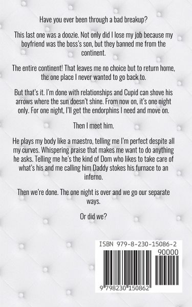 Have you ever been through a bad breakup? This last one was a doozie. Not only did I lose my job because my boyfriend was the boss's son, but they banned me from the continent. The entire continent! That leaves me no choice but to return home, the one place I never wanted to go back to. But that's it. I'm done with relationships and Cupid can shove his arrows where the sun doesn't shine. From now on, it's one night only. For one night, I'll get the endorphins I need and move on. Then I meet him. He plays my body like a maestro, telling me I'm perfect despite all my curves. Whispering praise that makes me want to do anything he asks. Telling me he's the kind of Dom who likes to take care of what's his and me calling him Daddy stokes his furnace to an inferno. Then we're done. The one night is over and we go our separate ways. Or did we?