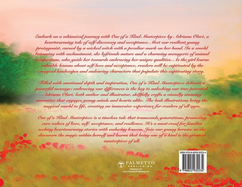 Embark on a Whimsical Journey of Self-Discovery and Magic! Dive into the enchanting world of One of a Kind Masterpiece - a captivating children's fantasy that sparks the imagination and celebrates the magic of self-discovery. Authored and illustrated by the talented Adriana Olari, this heartwarming tale introduces readers to a young girl navigating a world touched by both curses and wonders. In this beautifully crafted narrative, our resilient protagonist finds herself marked by a witch's curse, setting the stage for a transformative adventure. Joined by a delightful cast of animal friends and guided by the wisdom of nature, she embarks on a journey of self-acceptance. Through lush illustrations and a compelling storyline, Adriana Olari weaves a magical tapestry that not only entertains but also imparts essential lessons of self-love and resilience. One of a Kind Masterpiece is more than just a story - it's a visual feast for young minds, with each page bursting with color and charm. Adriana's artistic prowess brings the characters to life, creating an immersive experience that will capture the hearts of both children and their parents. The whimsical landscapes and endearing characters serve as a backdrop to a powerful message: embracing our uniqueness is the key to unlocking our true potential.