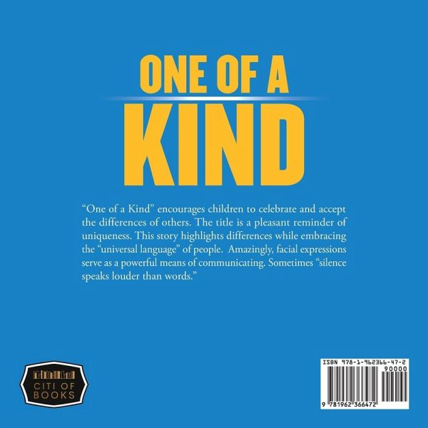 "One of a Kind" encourages children to celebrate and accept the differences of others. The title is a pleasant reminder of uniqueness. This story highlights differences while embracing the "universal language" of people. Amazingly, facial expressions serve as a powerful means of communicating. Sometimes " silence speaks louder than words."