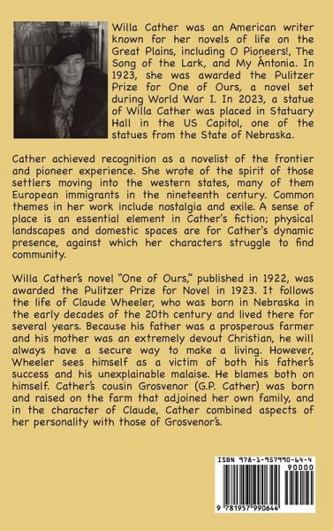 Willa Cather was an American writer known for her novels of life on the Great Plains, including O Pioneers!, The Song of the Lark, and My Ántonia. In 1923, she was awarded the Pulitzer Prize for One of Ours, a novel set during World War I. In 2023, a statue of Willa Cather was placed in Statuary Hall in the US Capitol, one of the statues from the State of Nebraska. Cather achieved recognition as a novelist of the frontier and pioneer experience. She wrote of the spirit of those settlers moving into the western states, many of them European immigrants in the nineteenth century. Common themes in her work include nostalgia and exile. A sense of place is an essential element in Cather's fiction; physical landscapes and domestic spaces are for Cather's dynamic presence, against which her characters struggle to find community. Willa Cather's novel "One of Ours," published in 1922, was awarded the Pulitzer Prize for Novel in 1923. It follows the life of Claude Wheeler, who was born in Nebraska in the early decades of the 20th century and lived there for several years. Because his father was a prosperous farmer and his mother was an extremely devout Christian, he will always have a secure way to make a living. However, Wheeler sees himself as a victim of both his father's success and his unexplainable malaise. He blames both on himself. Cather's cousin Grosvenor (G.P. Cather) was born and raised on the farm that adjoined her own family, and in the character of Claude, Cather combined aspects of her personality with those of Grosvenor's.