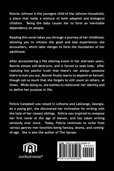 Ronnie Johnson is the youngest child of the Johnson household, a place that holds a mixture of both adopted and biological children. Being the baby causes her to form an inevitable dependency on people. Reading this novel takes you through a journey of her childhood, allowing you to witness the good and bad experiences she encounters, which later merges to form the foundation of her adulthood. After encountering a life altering event in her mid-teen years, Ronnie almost self-destructs, and is forced to seek help. After realizing the painful truth that there's not always someone there to bail you out, Ronnie finally learns to depend on herself, though not so much that she forgets to still count on others, at times. While doing so, she battles to rediscover her identity and to define her purpose in life.
