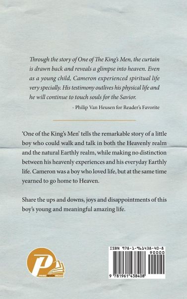 'One of the King's Men' tells the remarkable story of a little boy who could walk and talk in both the Heavenly realm and the natural Earthly realm, while making no distinction between his heavenly experiences and his everyday Earthly life. Cameron was a boy who loved life, but at the same time yearned to go home to Heaven. Share the ups and downs, joys and disappointments of this boy's young and meaningful amazing life.