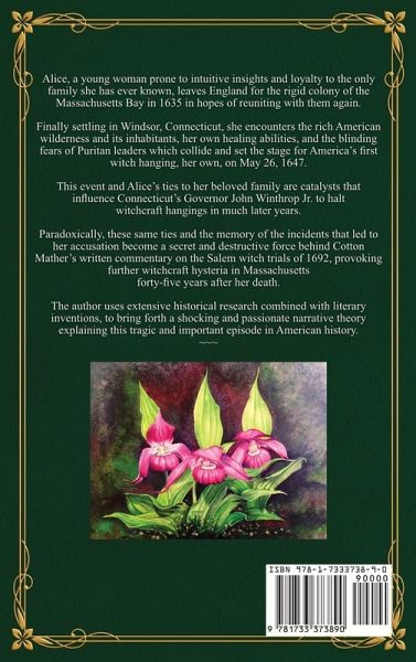 Alice, a young woman prone to intuitive insights and loyalty to the only family she has ever known, leaves England for the rigid colony of the Massachusetts Bay in 1635 in hopes of reuniting with them again. Finally settling in Windsor, Connecticut, she encounters the rich American wilderness and its inhabitants, her own healing abilities, and the blinding fears of Puritan leaders which collide and set the stage for America's first witch hanging, her own, on May 26, 1647. This event and Alice's ties to her beloved family are catalysts that influence Connecticut's Governor John Winthrop Jr. to halt witchcraft hangings in much later years. Paradoxically, these same ties and the memory of the incidents that led to her accusation become a secret and destructive force behind Cotton Mather's written commentary on the Salem witch trials of 1692, provoking further witchcraft hysteria in Massachusetts forty-five years after her death. The author uses extensive historical research combined with literary inventions, to bring forth a shocking and passionate narrative theory explaining this tragic and important episode in American history and in the life of Alice (Alse) Young, America's first witch hanging victim.