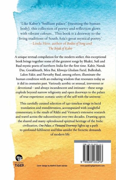 'Like Kabir's "brilliant palace" (meaning the human body), this collection of poetry and reflection glows with vibrant colours… This book is a doorway to the living traditions of South Asia's great mystical poetry. Step in to find joy, sorrow, wisdom, humour, love, challenge, and perhaps inspiration to enter the singing fields yourself!'-Linda Hess, author of Bodies of Song and The Bijak of Kabir A unique textual compilation for the modern seeker, this exceptional book brings together some of the greatest songs by Bhakti, Sufi and Baul mystic poets of northern India for the first time. Kabir, Nanak Das, Gorakhnath, Mira Bai, Khwaja Ghulam Farid, Bulleshah, Lalon Fakir, and Parvathy Baul, among others, illuminate the human condition with an enduring wisdom that resonates today as it did in centuries past. Variously acerbic or sensual, irreverent or devotional-and always incandescent and intimate-these songs explode beyond narrow religiosity and open doorways to the palace of true experience: ecstatic unity of the self with the universe. This carefully curated selection of 140 timeless songs in lucid translation and transliteration, accompanied with insightful commentary, is the result of Rikhi and Virmani's extensive research and travel across the subcontinent over two decades. Drawing upon the shared and many-splendoured spiritual heritage of the Indic civilization, One Palace, a Thousand Doorways lights up a path to profound fulfilment and bliss amidst the frenetic demands of modern life.
