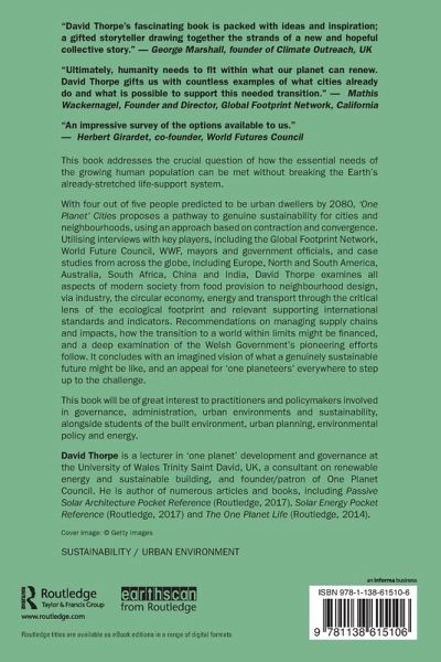 This book addresses the crucial question of how the essential needs of the growing human population can be met without breaking the Earth's already-stretched life-support system. With four out of five people predicted to be urban dwellers by 2080, 'One Planet' Cities proposes a pathway to genuine sustainability for cities and neighbourhoods, using an approach based on contraction and convergence. Utilising interviews with key players, including the Global Footprint Network, World Future Council, WWF, mayors and government officials, and case studies from across the globe, including Europe, North and South America, Australia, South Africa, China and India, David Thorpe examines all aspects of modern society from food provision to neighbourhood design, via industry, the circular economy, energy and transport through the critical lens of the ecological footprint and relevant supporting international standards and indicators. Recommendations on managing supply chains and impacts, how the transition to a world within limits might be financed, and a deep examination of the Welsh Government's pioneering efforts follow. It concludes with an imagined vision of what a genuinely sustainable future might be like, and an appeal for 'one planeteers' everywhere to step up to the challenge. This book will be of great interest to practitioners and policymakers involved in governance, administration, urban environments and sustainability, alongside students of the built environment, urban planning, environmental policy and energy.