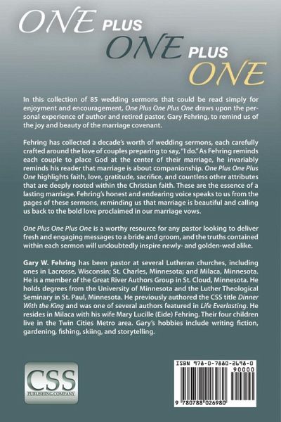 In this collection of 85 wedding sermons that could be read simply for enjoyment and encouragement, One+One+One draws upon the personal experience of author and retired pastor, Gary Fehring, to remind us of the joy and beauty of the marriage covenant. Fehring has collected a decade's worth of wedding sermons, each carefully crafted around the love of couples preparing to say, "I do." As Fehring reminds each couple to place God at the center of their marriage, he invariably reminds his reader that marriage is about companionship. One+One+One highlights faith, love, gratitude, sacrifice, and countless other attributes that are deeply rooted within the Christian faith. These are the essence of a lasting marriage. Fehring's honest and endearing voice speaks to us from the pages of these sermons, reminding us that marriage is beautiful and calling us back to the bold love proclaimed in our marriage vows. One+One+One is a worthy resource for any pastor looking to deliver fresh and engaging messages to a bride and groom, and the truths contained within each sermon will undoubtedly inspire newly- and golden-wed alike. Gary W. Fehring has been pastor at several Lutheran churches, including ones in Lacrosse, Wisconsin; St. Charles, Minnesota; and Milaca, Minnesota. He serves on the board of directors at the Milaca Area Food Pantry and is also a member of the Great River Authors Group in St. Cloud, Minnesota, as well as the Mission Table of the Minneapolis Area Synod of the ELCA. He holds degrees from the University of Minnesota and the Luther Theological Seminary in St. Paul, Minnesota. He previously authored the CSS title Dinner With the King and was one of several authors featured in Life Everlasting. He resides in Milaca with his wife Mary Lucille (Eide) Fehring, where they have four grown children. Gary's hobbies include writing fiction, gardening, fishing, skiing, and storytelling.