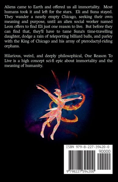 Aliens came to Earth and offered us all immortality. Most humans took it and left for the stars. Eli and Suna stayed. They wander a nearly empty Chicago, seeking their own meaning and purpose, until an alien social worker named Leon offers to find Eli just one reason to live. But the search may have to wait. A parasite stalks Chicago, and trillions of aliens drop dead throughout the galaxy. Suna uncovers a mystery involving ancient myths and the meaning of human life. But before they can solve those puzzles, they'll have to tame Suna's time-travelling daughter, dodge a rain of teleporting billiard balls, and parley with the King of Chicago and his army of pterodactyl-riding orphans. Eli seeks either love or death, and the parasite offers it to him if he'll betray humanity. Can Suna pull him back, with the meaning of life in her grasp? Hilarious, weird, and deeply philosophical, One Reason To Live is a high concept sci-fi epic about immortality and the meaning of humanity.