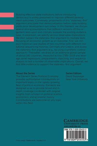 This Element analyses the value of effective state institutions before introducing democracy. To do so, it draws on an extensive global sample of about 180 countries, measured across 1789-2019 and leverage panel regressions, preparametric matching, and sequence analysis to test a number of observable implications.