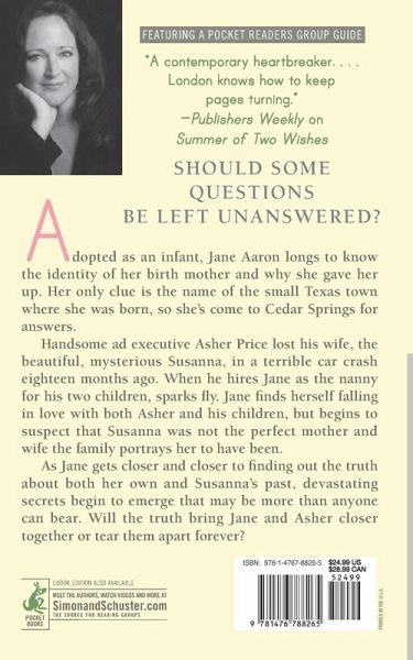 New York Times bestselling author Julia London’s second emotionally-charged contemporary romantic novel set in Cedar Springs, Texas. Should some questions be left unanswered? Adopted as an infant, Jane Aaron longs to know the identity of her birth mother and why she gave her up. Her only clue is the name of the small Texas town where she was born, so she’s come to Cedar Springs for answers. Handsome ad executive Asher Price lost his wife, the beautiful, mysterious Susanna, in a terrible car crash eighteen months ago. When he hires Jane as the nanny for his two children, sparks fly. Jane finds herself falling in love with both Asher and his children, but begins to suspect that Susanna was not the perfect mother and wife the family portrays her to have been. As Jane gets closer and closer to finding out the truth about both her own and Susanna’s past, devastating secrets begin to emerge that may be more than anyone can bear. Will the truth bring Jane and Asher closer together or tear them apart forever?