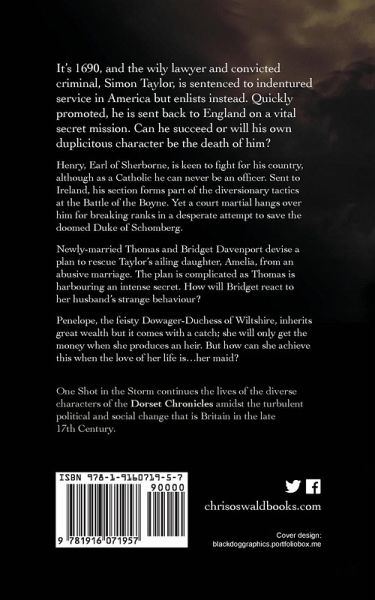 It’s 1690, and the wily lawyer and convicted criminal, Simon Taylor, is sentenced to indentured service in America but enlists instead. Quickly promoted, he is sent back to England on a vital secret mission. Can he succeed or will his own duplicitous character be the death of him? Henry, Earl of Sherborne, is keen to fight for his country, although as a Catholic he can never be an officer. Sent to Ireland, his section forms part of the diversionary tactics at the Battle of the Boyne. Yet a court martial hangs over him for breaking ranks in a desperate attempt to save the doomed Duke of Schomberg. Newly-married Thomas and Bridget Davenport devise a plan to rescue Taylor’s ailing daughter, Amelia, from an abusive marriage. The plan is complicated as Thomas is harbouring an intense secret. How will Bridget react to her husband’s strange behaviour? Penelope, the feisty Dowager-Duchess of Wiltshire, inherits great wealth but it comes with a catch; she will only get the money when she produces an heir. But how can she achieve this when the love of her life is…her maid? One Shot in the Storm continues the lives of the diverse characters of the Dorset Chronicles amidst the turbulent political and social change that is Britain in the late 17th Century.