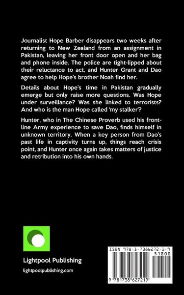 Journalist Hope Barber disappears two weeks after returning to New Zealand from an assignment in Pakistan, leaving her front door open and her bag and phone inside. The police are tight-lipped about their reluctance to act, and Hunter Grant and Dao agree to help Hope's brother Noah find her. Details about Hope's time in Pakistan gradually emerge but only raise more questions. Was Hope under surveillance? Was she linked to terrorists? And who is the man Hope called 'my stalker'? Hunter, who in The Chinese Proverb used his front-line Army experience to save Dao, finds himself in unknown territory. When a key person from Dao's past life in captivity turns up, things reach crisis point, and Hunter once again takes matters of justice and retribution into his own hands.