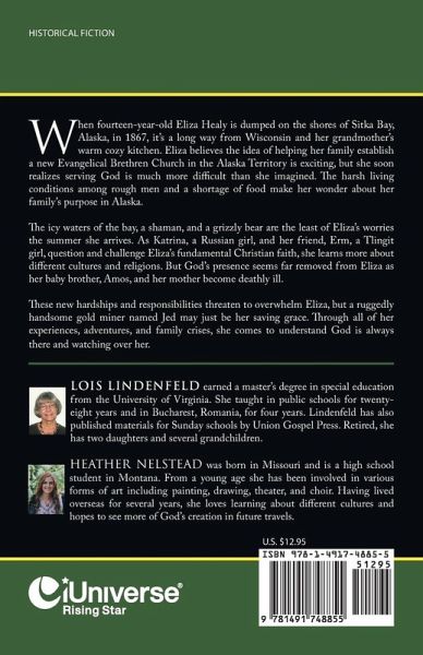 When fourteen-year-old Eliza Healy is dumped on the shores of Sitka Bay, Alaska, in 1867, it's a long way from Wisconsin and her grandmother's warm cozy kitchen. Eliza believes the idea of helping her family establish a new Evangelical Brethren Church in the Alaska Territory is exciting, but she soon realizes serving God is much more difficult than she imagined. The harsh living conditions among rough men and a shortage of food make her wonder about her family's purpose in Alaska. The icy waters of the bay, a shaman, and a grizzly bear are the least of Eliza's worries the summer she arrives. As Katrina, a Russian girl, and her friend, Erm, a Tlingit girl, question and challenge Eliza's fundamental Christian faith, she learns more about different cultures and religions. But God's presence seems far removed from Eliza as her baby brother, Amos, and her mother become deathly ill. These new hardships and responsibilities threaten to overwhelm Eliza, but a ruggedly handsome gold miner named Jed may just be her saving grace. Through all of her experiences, adventures, and family crises, she comes to understand God is always there and watching over her.