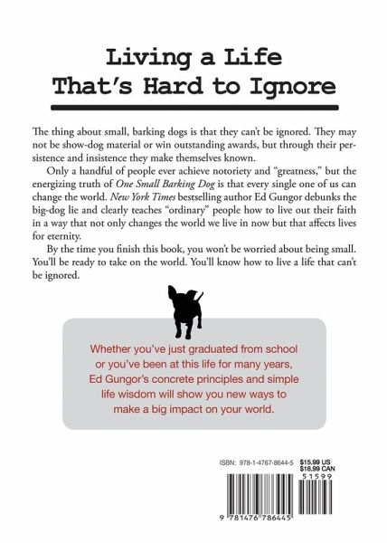 Small Is the New Big In this humorous, insistent book, Pastor Ed Gungor demonstrates that the world is changed most by ordinary people—the "small dogs" of the human race. Small dogs may not run the world, but neither can the world tune them out. If it weren’t for small dogs, the world might be a quieter place, but it would certainly be a needier one. With chapters like "Dare to Be Small," "Fight the Big-Dog Lie," and "The Bark of Faith," Gungor challenges the notion that earthly prominence, status, and power are essential to significance. Reminding us that small is the new big, he inspires us to fall in love with life—the everyday, normal kind—and shows us how to make an eternal difference. Living a Life That’s Hard to Ignore The thing about small, barking dogs is that they can’t be ignored. They may not be show-dog material or win outstanding awards, but through their persistence and insistence they make themselves known. Only a handful of people ever achieve notoriety and "greatness," but the energizing truth of One Small Barking Dog is that every single one of us can change the world. New York Times bestselling author Ed Gungor debunks the big-dog lie and clearly teaches "ordinary" people how to live out their faith in a way that not only changes the world we live in now but that affects lives for eternity. By the time you finish this book, you won’t be worried about being small. You’ll be ready to take on the world. You’ll know how to live a life that can’t be ignored. Whether you’ve just graduated from school or you’ve been at this life for many years, Ed Gungor’s concrete principles and simple life wisdom will show you new ways to make a big impact on your world.