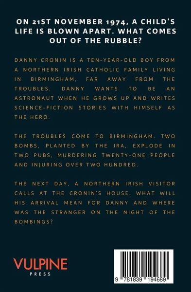 On 21st November 1974, a child's life is blown apart. What comes out of the rubble? Danny Cronin is a ten-year-old boy from a Northern Irish Catholic family living in Birmingham, far away from The Troubles. Danny wants to be an astronaut when he grows up and writes science-fiction stories with himself as the hero. The Troubles come to Birmingham. Two bombs, planted by the IRA, explode in two pubs, murdering twenty-one people and injuring over two hundred. The next day, a Northern Irish visitor calls at the Cronin's house. What will his arrival mean for Danny and where was the stranger on the night of the bombings?