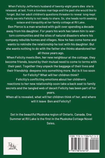 When Felicity Jefferies' husband of twenty-eight years dies, she is released, at last, from a loveless marriage and a past she would like to forget. But her adult children's questions threaten to reveal long-kept family secrets Felicity is not ready to share. So, Felicity heads north seeking solace and tranquility at her family cottage at Ril Lake. Ben Pierce is a man wracked with guilt over spending a decade away from his daughter. His work has taken him to worn-torn countries and the sites of natural disasters as his company rebuilds towns and villages. Now he has come home and wants to rekindle the relationship he lost with his daughter, But she wants nothing to do with the father she thinks abandoned her all those years ago. When Felicity meets Ben, her new neighbour at the cottage, they become friends, bound by their mutual need to come to terms with the past. Together they unpack the baggage of their lives and their friendship deepens into something more. But is it too soon for Felicity? What will her children think? Felicity's conflicting emotions about her children's reactions to her new relationship with Ben, take a back seat to family secrets and the tangled web of deceit Felicity has been a part of for years. When all is revealed, what will her children think of her and where will it leave Ben and Felicity? Set in the beautiful Muskoka region of Ontario, Canada, One Summer at Ril Lake is the first in the Muskoka Cottage Novel Series.
