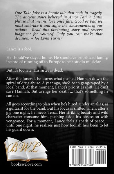 Lance is a fool He should've stayed home. He should've prioritized family, instead of running off to Europe to be a studio musician. But it's too late. His sister is dead After the funeral, he learns what pushed Hannah down the spiral of drug abuse. A year ago, she'd been gang-raped by a local band. At that moment, Lance's priorities shift. He can't save Hannah. But avenge her death...that's something he can do. All goes according to plan when he's hired, under an alias, as a guitarist for the band. But his focus is shifted when, after a gig one night, he meets Tessa. Her striking beauty and wild character consume him, pushing aside his obsession with vengeance. For a moment, Lance feels a spark of peace...until one night, he realizes just how foolish he's been to let his guard down Editorial Review ¿¿One Take Jake is a heroic tale that ends in tragedy. The ancient stoics believed in Amor Fati, a Latin phrase that means, love one's fate. Good or bad we must embrace it and suffer the consequences of our actions. Read this fascinating story and reserve judgment for yourself. Only you can make that decision. Joe Lynn Turner