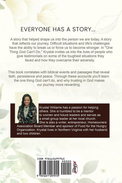 Everyone has a story... A story that helped shape us into the person we are today. A story that reflects our journey. Difficult situations and life's challenges have the ability to break us or force us to become stronger. In "One Thing God Can't Do," Krystal invites us into the lives of people who give testimonials on some of the toughest situations they faced and hoe they overcame their adversity. This book correlates with biblical events and passages that reveal faith, persistence and peace. Through these accounts you'll learn the one thing God can't do, and why trusting in God makes our journey more rewarding. Krystal Williams has a passion for helping others. She is humbled to be a mentor to woman and future leaders and serves as a small group leader at her church. She is also a writer, entrepreneur, Homeowners Association Board Member and sponsor of Food for the Hungry Organization. Krystal lives in Northern Virginia with her husband and two children.